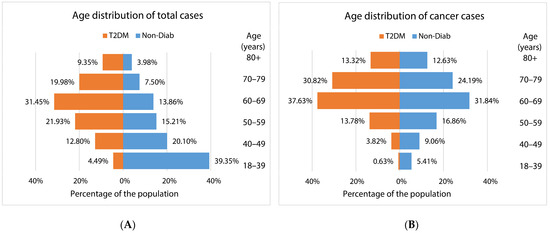 The age distribution of patients at risk and those with incident cancer showed a different pattern in patients with T2DM compared to the Non-Diab group (Figure 3A). The proportion of 18–39-year-old patients was highest in the Non-Diab group among total cases. However, among patients with T2DM but without cancer, the 60–69-year-old group dominated (Figure 3A). By contrast, among patients with cancer, the 60–69-year-old group dominated both in patients with and without T2DM (Figure 3B).