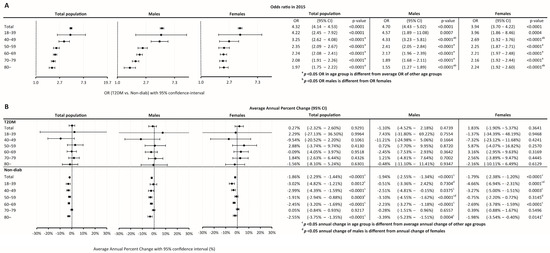 The odds ratio (OR) of having cancer in the T2DM group as compared to the Non-Diab group was 4.32 (4.14–4.53), p < 0.0001) in the total population, while it was 4.70 (4.43–5.02), p < 0.0001) and 3.94 (3.70–4.22), p < 0.0001) in males and females, respectively (Figure 4A).