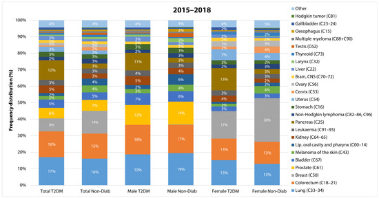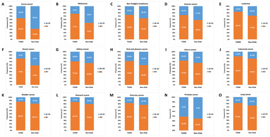 Comparing the age distribution for individual cancer types, we found that the contribution of the 60+ age group was similar for lung, pancreas, stomach, bladder, colorectal, uterine corpus, and kidney cancer, but with a dominance of the T2DM group. By contrast, in the case of cervix, melanoma, non-Hodgkin lymphoma, ovarian, and breast cancers, the contribution of the 18–59-year-old group was higher in the Non-Diab group than in the T2DM group (Figure 8).