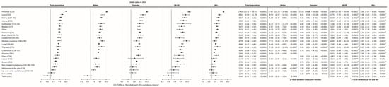 The highest odds of cancer were found for pancreas, liver, kidney, uterus, gallbladder, bladder, stomach, brain/CNS, leukemia, multiple myeloma, lung, thyroid, colorectum, prostate, ovary, larynx, breast, non-Hodgkin lymphoma, and melanoma of the skin in T2DM patients compared to the non-diabetic population (Figure 6). Pancreatic cancer had the highest odds (OR: 17.43). Cancer odds, in general, showed similar trends in male and female patients, whereas multiple myeloma, thyroid cancer, and melanoma had a stronger association with T2DM in males than in females. Several types of cancer showed a higher risk in the 18–59 vs. the 60+ age groups, including pancreas, liver, kidney, uterus, lung, colorectal, prostate, and ovarian cancers.