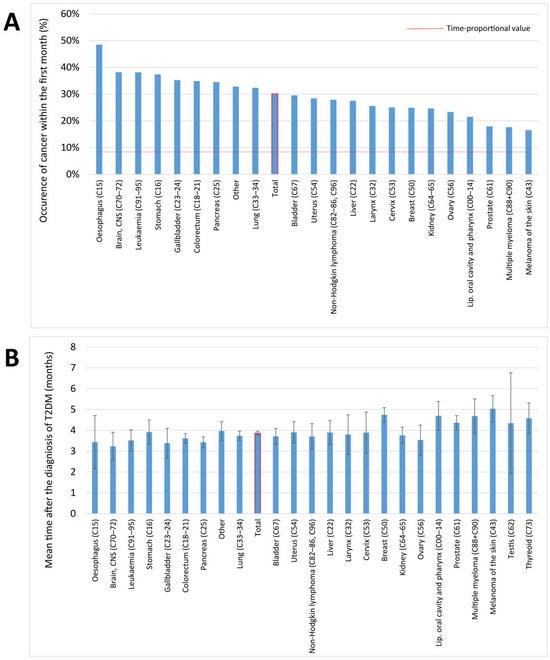 (A) Occurrence of cancer in the first month and (B) the average lag time of the detection of a cancer after the diagnosis of T2DM. The red line in panel (A) denotes 8.33%, that is the chance of getting cancer in the first month within the observation year, if it was by chance only (1/12).