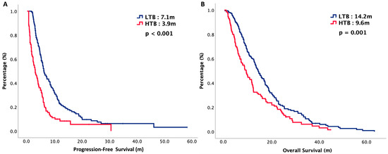 All patients’ characteristics were retrospectively retrieved from a medical chart review. The differences between HTB and LTB were compared with chi-square tests. Propensity-score matching was used to diminish patient selection bias. SPSS Version 26 was used for all of the statistical analyses. The caliper value was set at 0.2 and the parameters included gender, age, primary tumor location, initial stage, surgery, chemoradiotherapy, disease status, and first-line chemotherapy. The oncologic outcomes were presented as PFS and OS. PFS was defined as the time from the first day of first-line chemotherapy until tumor progression or final follow-up, while OS was defined as the time from the first day of first-line chemotherapy until the date of death or final follow-up. Kaplan–Meier curves were plotted for survival. Multivariate analysis was also performed with a Cox regression model using “enter” selection to adjust the influences of potential confounders. p values were all two-sided and defined to be significant if p values < 0.05.