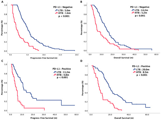 The median follow-up period of our study was 13 months. At the time of analysis, 86% of the patients were deceased and malignancy was the major reason leading to death. The median PFS of LTB and HTB were 7.1 months versus 3.9 months, respectively (p < 0.001), while the median OS of LTB and HTB were 14.2 months versus 9.2 months, respectively (p = 0.001). Figure 1 plots the survival curves of PFS and OS. Subgroup analysis was performed with PD-L1 expression status. For patients with negative PD-L1 expression, the median PFS of LTB and HTB were 5.0 months versus 1.6 months, respectively (p < 0.001), while the median OS of LTB and HTB were 14.2 months versus 5.0 months, respectively (p < 0.001). For patients with positive PD-L1 expression, the median PFS of LTB and HTB were 11.2 months versus 4.8 months, respectively (p < 0.001) while the median OS of LTB and HTB were 20.0 months versus 8.5 months, respectively (p < 0.001). Figure 2 plots the survival curves of PFS and OS, stratified by PD-L1 status.