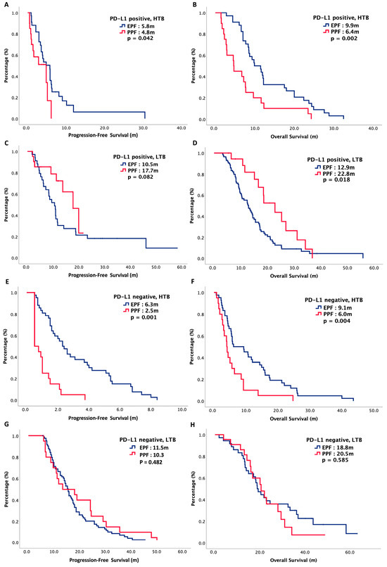 In summary, HTB patients receiving EPF had better outcomes than those receiving PPF, regardless of PD-L1 expression. For LTB PD-L1 positive patients, there was a longer survival with PPF than EPF, while for LTB PD-L1 negative patients, survival was similar between PPF and EPF. Figure 3 plots the survival curves of PFS and OS, stratified by PD-L1, tumor burden and chemotherapy regimen.