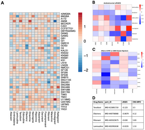 Summarized reversal of gene expression scores (sRGESs) for glioblastoma accurately predict drug efficacy based on the reversal of transcriptional cellular signatures [13]. GBM signatures from The Cancer Genome Atlas (TCGA) were matched to samples from the Cancer Cell Line Encyclopedia (CCLE) as described previously [14]. The profiles were compared to preprocessed RNA-seq data from human frontal lobe tissue from the Genome Tissue Expression Project (GTEX) to determine differential expression. Drug expression profiles were characterized by accessing data from the LINCS L1000 assay to determine compound-induced changes in gene expression, as shown previously by Shah et al. [6]. Gene expression counts and Central Nervous System Multiparametric Optimization (CNS-MPO) values were also attained by filtering the data for antiretroviral therapies. Data were visualized using Microsoft Excel v16.84 and the pheatmap function in R v4.2.3.