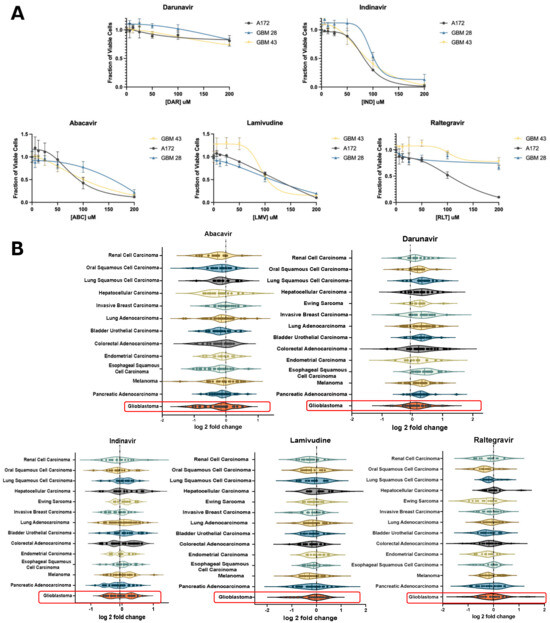 In vitro validation of candidate ARTs. (A) XTT assay of patient-derived glioblastoma cell lines (GBM 28, 43) and a pure glioma cell line (A172) showing the effect of select antiretrovirals on cell viability relative to increased dosing. (B) Violin plots depicting the impact of select antiretroviral drugs on the survival of established cell lines stratified based on primary cancers in the Cancer Dependency Map database with greater than 10 established cell lines. This demonstrates the relative effect of each antiretroviral drug on the log2fold change in survival for each primary cancer. Highlighted plots represent GBM and demonstrate a median log2fold change of less than 0 when treated with abacavir, lamivudine, and raltegravir.