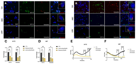 Reverse transcriptase inhibitors decrease stemness and self-renewal capacity. (A,B) Identified foci of stemness markers using IF of A172 and U87 cells treated with ABC 20 μM and LMV 20 μM for 48 h. OCT-4 (green), vimentin (red), and DAPI. (C,D) Quantification of fold change of foci shows a significant decrease in expression after treatment. (E,F) Cell proliferation assessed by xCelligence assay of A172 and U87 cell lines while treated with ABC 20 μM and LMV 20 μM: RTIs significantly decreased proliferation compared to control. (ANOVA, r * p < 0.05, ** p < 0.01, *** p < 0.001, **** p < 0.0001).