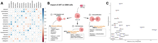 Previously, reverse transcriptase had been proposed as a target for cancer therapy since undifferentiated cancer cells tend to express higher levels of RT than differentiated cells [39,40]. In other cancer cell lines, inhibition of endogenous RT with efavirenz and nevirapine reduced proliferation and exhibited cytostatic effects, suggesting a role of RTI drug repurposing for oncology [41]. Our analysis of 16 ARTs in 40 glioma cell lines revealed several candidates for in vitro experiments, including the RTIs ABC and LMV. Using pharmacogenetic screening based on LINCS1000 signature profiles, we also identified that most ART drug regimens reverse the GBM disease signature, which is a hallmark of drug efficacy. sRGESs summarize the ability of a drug to reverse the cancer-specific transcriptomic signature; this tool has been previously validated in several cancers, including GBM, and correlates strongly with in vitro cytotoxicity. For GBM specifically, NRTIs (ABC and LMV) reduced cell viability and decreased stemness markers in vitro in GBM cell lines.