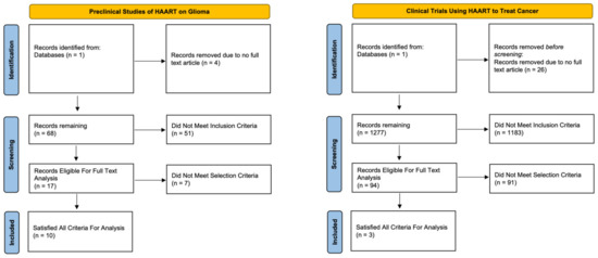Systematic review flow chart for preclinical trials utilizing antiretroviral medications for the treatment of established glioma cell lines and clinical trials utilizing antiretroviral medications for the treatment of various cancers.