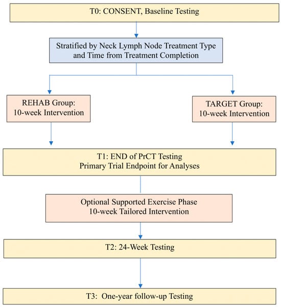 Randomization was stratified by (1) the time from diagnosis (within 18 months) or late (greater than 18 months); and (2) the type of cervical lymph node treatment: radical neck dissection (i.e., spinal accessory nerve sacrificed), modified/selective neck dissection with spinal accessory nerve spared, or radiation therapy to the lymph nodes in the neck only (i.e., no surgery). In each stratum, participants were randomized in a one-on-one ratio to the REHAB group: a shoulder and neck protocol; or to the TARGET group: the shoulder and neck protocol with the addition of lower extremity resistance exercise training program.