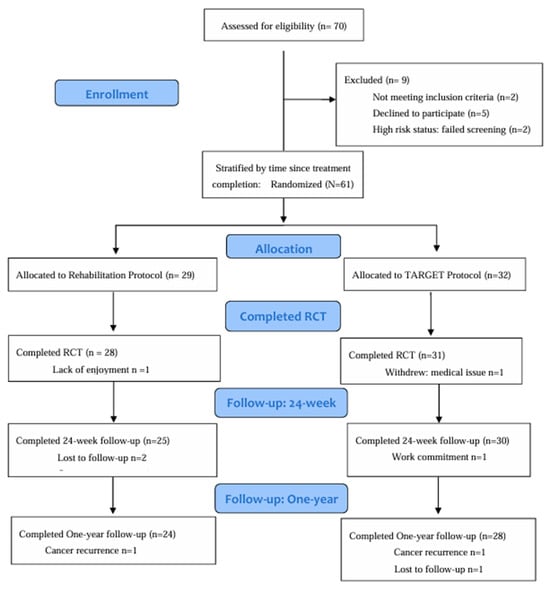 Based on data from the 12-month follow-up of our previous trial, fifty-two HNC survivors were required to have an 80% chance of detecting, as significant at the 5% level, an increase in quality of life (FACT-F) of 3 points (standard deviation, 9) in the REHAB group and 10 points in the TARGET experimental group at the end of the PrCT. Based on an anticipated 15% drop-out/loss to follow-up, an additional eight participants were added for a total sample of 60 (i.e., 30 per group).