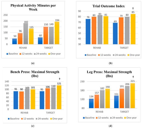 Participants in both groups continued to improve over the one-year follow-up (Supplementary Material: Tables S1 and S2). Paired comparisons confirmed significant within-group improvements in both intervention groups from baseline to one-year follow-up for the six-minute walk test, body mass index, NDII, active shoulder abduction range of motion, grip strength, sit-and-reach flexibility test, one-repetition maximum seated row, upper extremity endurance, and physical activity minutes (Figure 3a). The TARGET group showed within-group improvements for the FACT-F, Trial Outcome Index, as well as the one-repetition maximum bench press and leg press. There were no significant between-group differences in outcomes at the 24-week follow-up. Significant between-group differences were found in favor of the TARGET group for the change score from baseline to one-year for the Trial Outcome Index, and both the one-repetition maximum bench press and leg press (Figure 3b–d).
