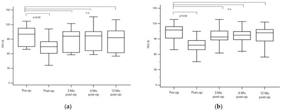 Longitudinal Changes in FEV1 Following Laser-Assisted Pulmonary Metastasectomy. Preoperative lung function parameters for the entire cohort were unimpaired, and the median FEV1 in percent predicted was 98% (range from 58% to 139%). Immediately performed postoperative lung function analysis was reduced with a median FEV1 in percent predicted of 71%; ∆ = 27% (range from 36% to 122%); p < 0.001. In follow-up at 3 months postoperation, the median FEV1 was 90%; ∆ = 8% (range from 45% to 128%); after 6 months, 93%; ∆ = 5% (range from 58% to 136%) and after 12 months the median FEV1 in percent predicted was 96% ∆ = 2% (range from 44% to 132%). These follow-up FEV1 recovered and were not significantly altered compared with the preoperative lung function (p > 0.05, denoted as n.s. for ‘not significant’).