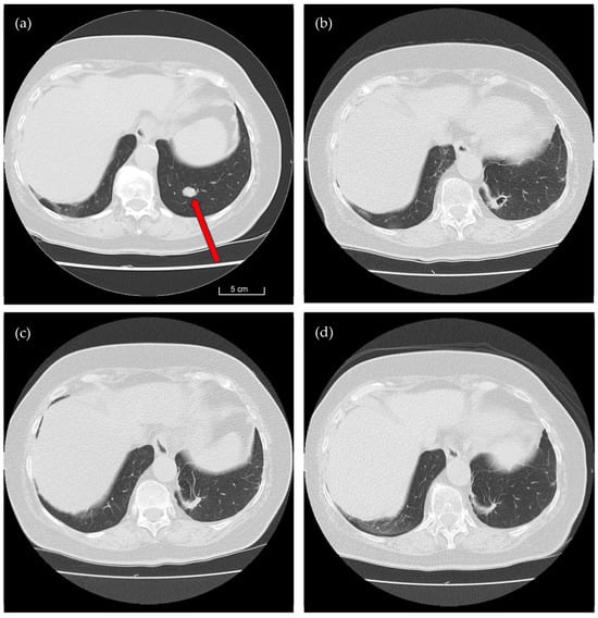 CT Findings Prior and After Laser-Assisted Pulmonary Metastasectomy. This set of four CT images illustrates the longitudinal course of pulmonary metastasectomy in a 74-year-old female patient diagnosed with two metastases of renal cell carcinoma in the left lung. The images provide a comprehensive view of postoperative changes over a period of one year. (a): this CT scan was captured four weeks before the laser-assisted metastasectomy. It displays a distinct metastatic lesion measuring approximately 12 mm in Segment 10 of the left lung (red arrow). (b): three months after the surgical procedure, Image b reveals significant changes in the left lung. A characteristic air-filled cavity resulting from laser ablation is clearly visible in Segment 10. (c): Six months post-surgery, the previously formed pulmonary cavity has completely resolved, leaving only residual scar tissue at the resection site. (d): a CT scan captured 12 months postoperatively shows further regression. The residual scar tissue in Segment 10 continues to diminish, demonstrating gradual but progressive recovery.