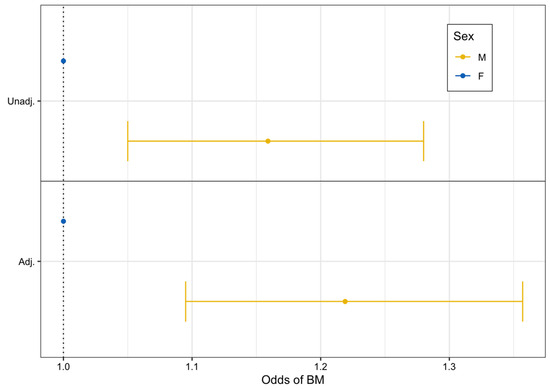 From unadjusted logistic regression modeling, we found that males had 16% higher odds of developing BrM compared to females (unadjusted OR: 1.16, 95% CI: 1.05–1.28, p = 0.003). After adjustment for additional factors, males still had statistically significantly higher odds of BrM development compared to females (adjusted OR: 1.22, 95% CI: 1.10–1.36, p < 0.001) (Figure 1).
