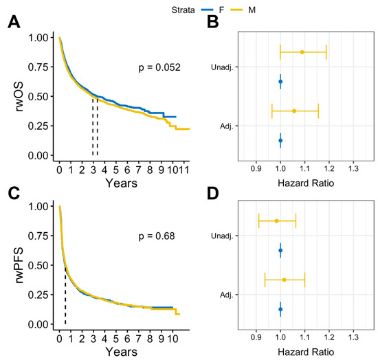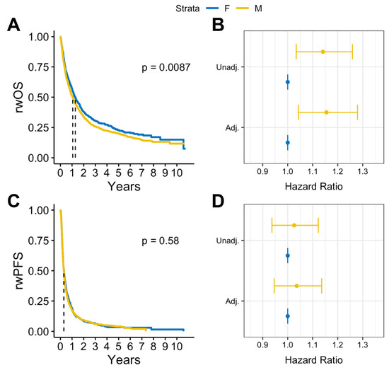 In survival analysis, we found that among patients with BrM, males had statistically significantly lower median rwOS than females (13 months vs. 15 months, log rank p = 0.009), but there was no observed difference in rwPFS (log rank p = 0.58) (Figure 2A,B). Similar results were observed after adjusting for covariates. Among patients with BrM, males had worse rwOS compared to females (adjusted HR: 1.18, 95% CI:1.05-1.32, p = 0.005) when adjusted for select covariates (Figure 2C). No statistically significant differences by sex were observed on rwPFS (Figure 2D). Overall, in patients with advanced melanoma without documented BrM, there were no statistically significant sex differences in either rwOS or rwPFS observed (Figure 3).