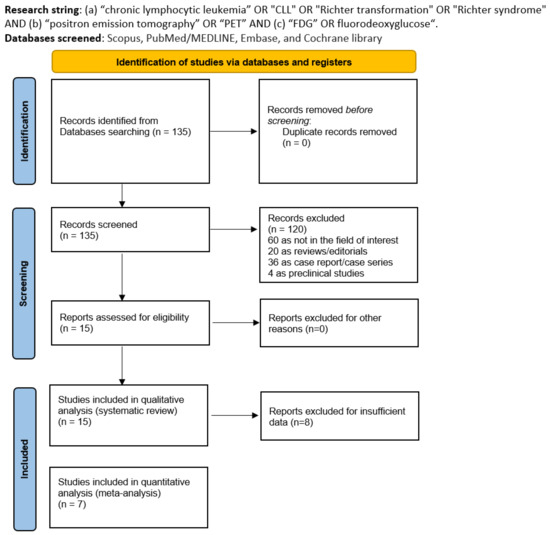 A comprehensive literature search of the PubMed/MEDLINE, Embase, and Cochrane library databases was conducted to extract relevant published articles about the diagnostic performance of 2-[18F]FDG PET or PET/CT in detecting RT. The ClinicalTrials.gov database was additionally searched for ongoing investigations (access date: 1 March 2024). We created and used a search algorithm based on a combination of the terms (a) “chronic lymphocytic leukemia” OR “CLL” OR “Richter transformation” OR “Richter syndrome” AND (b) “positron emission tomography” OR “PET” AND (c) “FDG” OR “fluorodeoxyglucose”. No start date limit was used; the search was updated until 31 March 2024. In order to enlarge our analysis, the retrieved articles’ references were also screened for searching additional articles related to the topic of interest.