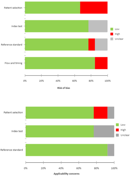 The overall estimation of the risk of bias and concerns regarding the applicability of articles included in the systematic review according to QUADAS-2 are summarized in Figure 2.