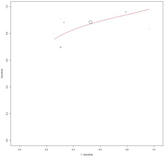 SROC curve of index test’s diagnostic accuracy using an SUVmax cut-off of 5 to predict RT.