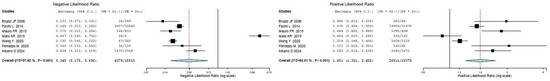 Pooled negative and positive likelihood ratios of the index test in the assessment of RT applying a SUVmax cut-off of 5 as the threshold [14,19,20,22,24,25,28]. Legend: 95% C.I.: 95% confidence interval; TP: true positive; FN: false negative; FP: false positive; TN: true negative.