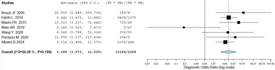 Pooled diagnostic odds ratio of the index test in the assessment of RT applying an SUVmax of 5 as threshold [14,19,20,22,24,25,28]. Legend: 95% C.I.: 95% confidence interval; TP: true positive; FN: false negative; FP: false positive; TN: true negative.