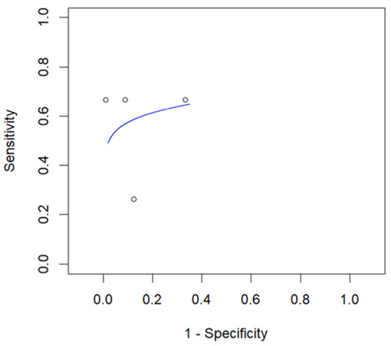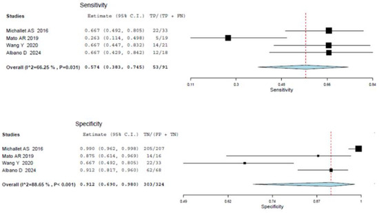 Four articles including 526 patients diagnosed with CCL reported the diagnostic performance of an SUVmax cut-off of 10 to predict RT and were included in the random-effects patient-based meta-analysis [21,22,24,28]. Based on a per-patient analysis, the pooled sensitivity and specificity of 2-[18F]FDG PET for the assessment of RT were 0.574 (95% CI: 0.383–0.745) and 0.912 (95% CI: 0.690–0.6980). The related SROC curve and forest plots are shown in Figure 6 and Figure 7, respectively. There was significant statistical heterogeneity among the studies included in this analysis, as the inconsistency index was always higher than 50%. Due to the constrained number of included studies in this analysis, a subgroup test was not feasible.