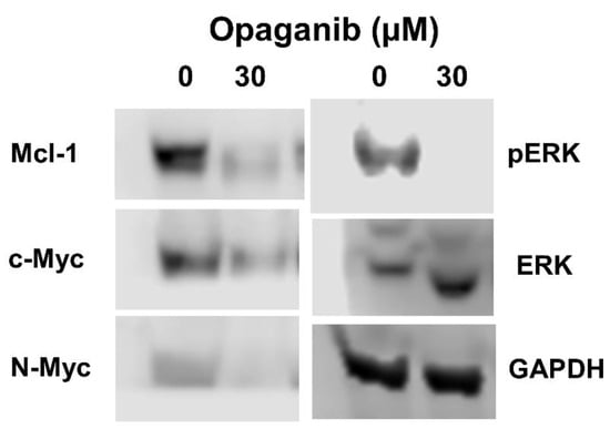 The effects of opaganib on intracellular signaling proteins in Neuro-2a cells were examined by immunoblotting (Figure 1). As with other tumor cells, treatment of Neuro-2a cells with opaganib decreased the expression of both c-Myc and Mcl-1 (48% and 70%, respectively) and completely eliminated pERK. Importantly, opaganib also reduced N-Myc protein expression in Neuro-2a cells (50%). Overall, treatment of NB cells with opaganib decreases proliferative signaling (c-Myc, N-Myc, and pERK) in concert with removing anti-apoptotic signaling (Mcl-1).
