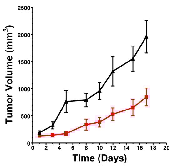 In the second study, Neuro-2a cells were used because they are a common model for NB tumors grown in immunocompetent syngeneic mice [46]. In these studies, male A/J mice were injected on the right hind flank with 106 Neuro-2a cells suspended in 100 µL of PBS/Geltrex, and tumors were monitored until they reached 150–250 mm3. Mice were then randomized into treatment groups (N = 9–10 mice/group) and received: vehicle; opaganib alone; IRIN + TMZ; and opaganib + IRIN + TMZ at the same doses and schedule used in the LLC model. Tumor volumes and animal health were monitored as indicated above, and individual mice were euthanized when their tumor volume exceeded 3000 mm3 per IACUC requirements. As shown in Figure 4, the body weights of the vehicle-treated, tumor-bearing mice decreased approximately 5% in the first 10 days of the study, suggesting that this strain is more susceptible to cachexia than are C57BL/6 mice. Body weight loss increased slightly in all the drug-treated groups; however, this was not sufficient to necessitate the euthanasia of any of the animals.