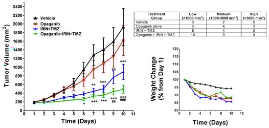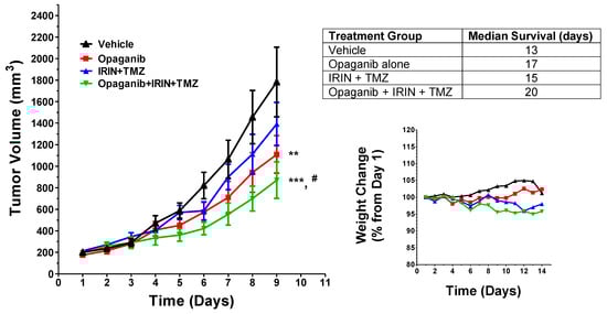 Effects of opaganib in combination with irinotecan and temozolomide on LLC tumor growth. Immunocompetent C57BL/6 mice bearing LLC tumors (n = 7 or 8/group) were treated with the following: vehicle; opaganib; IRIN + TMZ; or a combination of opaganib + IRIN + TMZ. (Left Panel): The average tumor volume of each group is shown for each day, and statistical comparisons on Day 9 are indicated (** p < 0.01 from the vehicle group, *** p < 0.001 from the vehicle group, # p < 0.05 from the IRIN + TMZ group). (Right Panel): The average body weights of mice in each treatment group are shown up to Day 14, completion of 2 full cycles of drug treatments. Table: Individual mice were sacrificed when the tumor volume reached >3000 mm3. The median survival in days is shown for each treatment group.