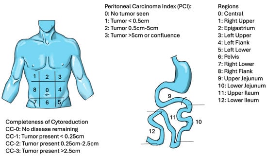 Cytoreductive surgery (CRS) was first conceptualized nearly a century ago for the debulking of ovarian cancers [22,23,24]. Thereafter, a hyperthermic peritoneal perfusion system to deliver IP therapy was designed to deliver chemotherapy directly to the tumor surface [25]. In order to adequately select patients and to communicate effectively the extent of disease, Jacquet and Sugarbaker established the peritoneal carcinoma index (PCI) scoring system assessing tumor distribution and extent of disease within the abdomen [26,27,28] (Figure 1).