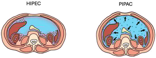 HIPEC and PIPAC. HIPEC involves the administration of chemotherapy in a heated perfusate to improve the efficacy of the chemotherapy. PIPAC delivers chemotherapy as an aerosolized substance under laparoscopic pressurization, leading to greater spatial distribution and tissue penetration of the drug.