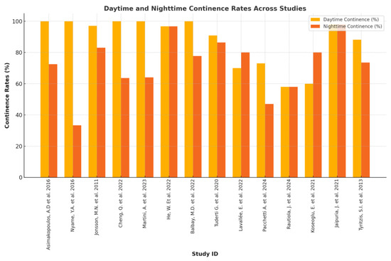 DC rates across studies ranged from 70% to 90.9% at 12 months, underscoring the critical importance of preserving pelvic structures during pelvic organ-preserving and sex-sparing RARC. Key anatomical structures, such as the vaginal wall, pelvic floor, and autonomic nerve pathways, are essential for supporting the reconstructed neobladder and urethral sphincter, making their preservation pivotal for continence recovery. Sex-sparing approaches demonstrated the most favorable outcomes, with 90.9% of women achieving DC within 12 months due to meticulous pelvic anatomy preservation [29]. Lavallée, in their pelvic organ-preserving RARC series, reported a 70% DC rate at one year through maintaining neurovascular bundles and autonomic pathways vital for sphincter function [30]. Anterior vagina wall preservation techniques demonstrated DC rates of up to 73% [31]. Rautiola et al. further confirmed that careful dissection and autonomic nerve preservation significantly improve continence outcomes [20]. Outcomes varied in smaller studies based on surgical technique and patient-specific factors. For instance, in a genitalia-preserving cohort, some patients achieved full continence, while others experienced varying degrees of incontinence, influenced by preoperative bladder function, surgical complexity, and nerve preservation [32]. NC recovery, which is generally more challenging than daytime, improved significantly when autonomic nerve pathways were preserved. Sex-sparing surgery yielded 86.4% NC recovery at 12 months [29], and pelvic organ-preserving RARC achieved 83% over the same period [30]. In contrast, non-preserving approaches struggled, with only 47% attaining nocturnal control [31]. Variability was also seen in genitalia-preserving RARC, with outcomes ranging from good to poor depending on individual factors [32] such as adherence to rehabilitation protocols, age and comorbidities. Overall, these findings highlight the clear advantages of pelvic organ-preserving and sex-sparing techniques in optimizing both daytime and nighttime continence. Maintaining the pelvic anatomy’s structural and functional integrity remains key, but outcome variability emphasizes the need for refined surgical strategies and personalized postoperative care. Early rehabilitation and targeted interventions, such as pelvic floor muscle training, are crucial to closing the gap between daytime and nighttime control, ultimately improving patients’ QoL after RARC. Figure 1 shows a graphical representation of continence outcomes.