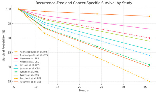 RARC has demonstrated oncological outcomes comparable to open radical RC (ORC) [14]. Key metrics—including negative surgical margins (NSM), recurrence-free survival (RFS), cancer-specific survival (CSS), and lymph node dissection (LND) yields—suggest that RARC can be an effective surgical option for bladder cancer. However, the variability in results, particularly in advanced disease stages, highlights the importance of cautious interpretation and appropriate patient selection. High NSM rates are consistently reported in studies of RARC. Asimakopoulos et al. [24] observed a 97.5% NSM rate in their cohort, with a single case of a soft tissue-positive margin in a pT3a tumor. Preservation-focused approaches, including fascia-sparing [28] and detrusor apron-sparing [27], also achieved NSM rates of 100%. These results suggest that RARC can achieve high surgical precision. Still, positive margins in advanced cases, such as those reported by Koseoglu et al. (40% positive margins in pT4 cases) [32], underscore the challenges in more aggressive diseases. RFS and CSS further reflect the oncological reliability of RARC. Asimakopoulos et al. reported a 97.5% RFS at 26.5 months, and Jonsson et al. observed 84% RFS and 86% CSS at 36 months. Tyritzis et al., evaluating bilateral NS RARC, noted an RFS of 80.7% at 30 months, suggesting that nerve-preserving approaches do not necessarily compromise cancer control [22,24,26,29]. In female patients undergoing organ-preserving RARC, studies by Tuderti et al. and Lavallée et al. reported 100% and 83% RFS, respectively [29,30]. However, Pacchetti et al. documented lower CSS at 80% over three years, with distant metastases in 27.3% of patients, emphasizing the need for improved strategies in high-risk and advanced cases [31] (Figure 2).