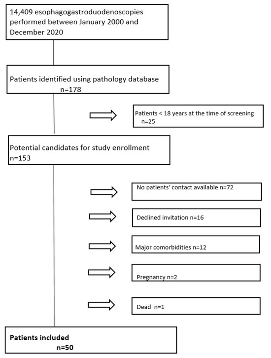 We identified 178 paediatric patients who had undergone EGD with gastric biopsies of any indication at the University Children’s Hospital Ljubljana, Slovenia, between January 2000 and December 2020, whose stomach biopsies revealed the presence of GIM. Of these, 153 were eligible for study participation based on age (≥18 years). However, due to the extended interval between the initial EGD and the study period, contact could not be established with 72 (47%) patients. An additional 16 (10%) patients declined to participate. Patients with significant comorbidities or pregnancy were also excluded from the study.
