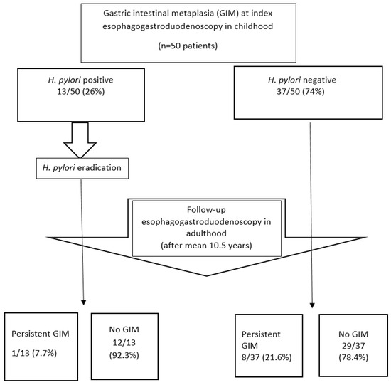 - Mansuri, I.; Goldsmith, J.D.; Liu, E.; Bonilla, S. Gastric Intestinal Metaplasia in Children: Natural History and Clinicopathological Correlation. J. Pediatr. Gastroenterol. Nutr. 2023, 77, 332–338. [Google Scholar] [CrossRef] [PubMed]