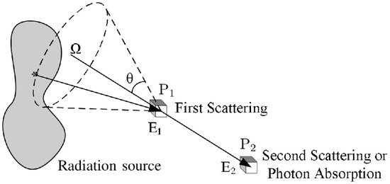 The iterative step in Equation (6), also known as binned-mode MLEM, could be applied to reconstruct the image. However, in the case of a Compton camera, the number D of possible detector elements in can be exceedingly high; for example, a practical Compton camera could have first-detector elements, the same number of second-detector elements, and energy channels, resulting in [11]. Since a typical Compton camera dataset size is of the order of events, most of the possible detector bins will contain zero. An alternative approach, the so-called list-mode MLEM [15,16,17,18], can be adopted in order to reduce computational cost. In this approach, the number of detector bins D is assumed to be very large, so that most of them contain zero counts, while the occupied bins contain only one count. This is basically equivalent to considering infinitesimal bins. If N is the number of detected events, denotes the set of all occupied bins, and the observation vector becomes: