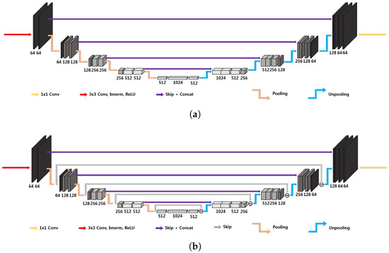 The three-dimensional U-Net architecture, illustrated in Figure 4a, initially proposed for biomedical image segmentation, is widely used for inverse problems [33]. The network is characterized by an encoder–decoder structure organized recursively into several levels, with the next level applied to the low-resolution signal of the previous layer [19]; the encoder part consists of convolutional layers, average pooling layers, denoted by , batch normalization and ReLUs, and the decoder consists of average unpooling layers, denoted by , and convolution. There are also skip connections through channel concatenation, which allow retaining the high-frequency content of the input signal. The pooling and unpooling layers determine an exponentially large receptive field. As outlined in [19], the extended average pooling and unpooling layers ( and , respectively) do not satisfy the frame condition, which leads to an overemphasis of the low-frequency components of images due to the duplication of the low-frequency branch [29], resulting in artifacts.