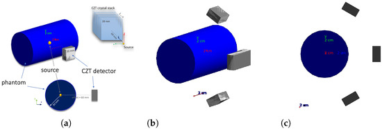 A Geant4 simulation of the CZT detector modules in a BNCT setting was implemented in order to assess the accuracy in the source reconstruction and optimize detector geometry. For the simulation, the G4EMStandardPhysics and G4DecayPhysics classes were used. The range cut value of mm was set. A small animal (or human patient irradiated body part with comparable dimensions) was simulated with a cylinder of radius 30 mm and height 100 mm, declared with the standard soft-tissue material G4_TISSUE_SOFT_ICPR. A single 3D CZT sensor module is composed by four 3D CZT drift strip detectors described in [37], each of which ideally assumed to be a CZT 20 mm mm mm parallelepiped in the simulation, stacked along the y direction (see Figure 6a). Besides the configuration with a single sensor module with the plane parallel to the cylinder axis, placed at a distance of 60 mm from the cylinder center, equidistant from the cylinder bases, illustrated in Figure 6a, other configurations with different numbers of modules in different positions were considered.