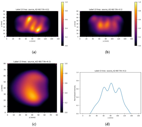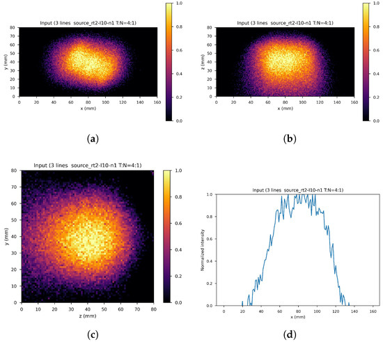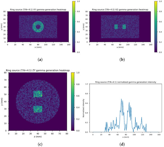 Figure 7 shows the ring gamma source distribution with a concentration ratio 4:1 in the parallelepipedonal region of size 160 mm mm mm. Figure 7a is the XY gamma generation heatmap for mm, Figure 7b represents the XZ gamma generation heatmap for mm, Figure 7c is the YZ gamma generation heatmap for mm, and Figure 7d is the normalized intensity as a function of x for mm.
