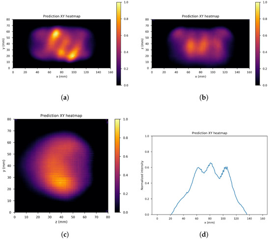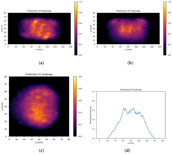 An example of network input. (a) XY gamma generation heatmap, (b) XZ gamma generation heatmap, (c) YZ gamma generation heatmap, and (d) normalized intensity as a function of x.