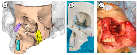Example of 3D printing guidance design using Reconeasy-3D Software. (A) Preoperative virtual simulation created using DICOM data extracted from computed tomography (CT) and magnetic resonance imaging (MRI), virtually marking the areas for osteotomy guidance (B) The rapid prototype 3D model of the maxilla, displaying osteotomy lines to guide tumor resection and a prefabricated orbital mesh plate customized for the orbital floor defect, prepared for precise anatomical restoration during surgery. (C) Intraoperative view showing maxillectomy performed according to the preoperative plan created with 3D printing.