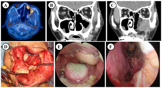 Clinical images of 79 years old male who had 3D printing-guided salvage maxillectomy after the failure of definitive chemoradiation. (A) PET-CT revealed maxillary sinus cancer in anterolateral wall of sinus. (B) Preoperative CT coronal image showed maxillary sinus cancer involving orbital inferior wall, inferolateral wall of maxillary sinus. (C) Postoperative CT image revealed well-reconstructed orbital plated and anterolateral thigh free flap at 3 months after the surgery. (D) Intraoperative image of maxillectomy defect and reconstruction with anterolateral thigh free flap and prefabricated orbital mesh plate. (E,F) Endoscopic image of hard palate and nasal cavity reconstructed by anterolateral free flap at 3 months post operation.