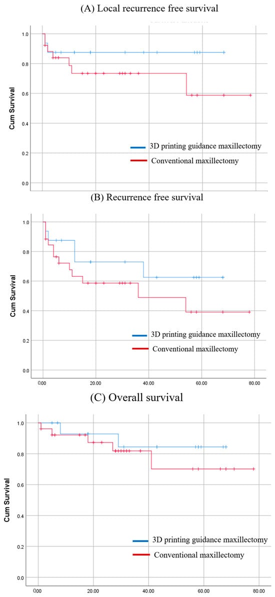 Kaplan–Meier survival plot with log-rank test between the 3D printing-guided maxillectomy group and conventional maxillectomy group. (A) Local recurrence free survival (p = 0.236); (B) overall recurrence free survival (p = 0.233); (C) overall survival (p = 0.435).