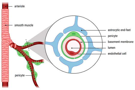 - Hall, C.N.; Reynell, C.; Gesslein, B.; Hamilton, N.B.; Mishra, A.; Sutherland, B.A.; O’Farrell, F.M.; Buchan, A.M.; Lauritzen, M.; Attwell, D. Capillary Pericytes Regulate Cerebral Blood Flow in Health and Disease. Nature 2014, 508, 55–60. [Google Scholar] [CrossRef] [PubMed]