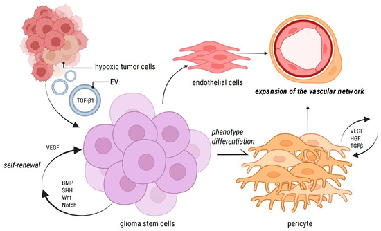Other stem cells implicated in GB vasculogenesis are myeloid stem cells, derived from bone marrow. They may differentiate into pericyte progenitors and contribute to neoangiogenesis [58]. This process is driven by CXCL12 (C-X-C motif chemokine ligand 12), a chemokine regulated by HIF-1α (hypoxia-inducible factor 1-alpha). Under hypoxic conditions, common in the glioblastoma microenvironment, HIF-1α is stabilized and induces the expression of CXCL12. This chemokine mobilizes hematopoietic-derived cells, including a small fraction of pericyte progenitors, and recruits them to the tumor, where they contribute to vascular remodeling. It has been described that this mechanism depends on the presence of MMP9 (matrix metalloproteinase 9), an enzyme secreted by tumor cells and tumor-associated stromal cells, which plays a critical role in degrading the extracellular matrix. MMP9 facilitates the release of VEGF (vascular endothelial growth factor) that is sequestered in the tumor extracellular environment. The liberation of VEGF promotes angiogenesis and the incorporation of vascular-modulating cells into the growing tumor network [59].