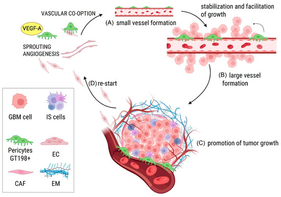 Hypothetical model integrating various theories of angiogenesis involving pericytes in GB. (A) Sprouting endothelial cells, supported by pericytes, initiate the formation of new blood vessels by co-option; (B) pericytes in the tumor microenvironment stabilize these nascent vessels and, as progenitor-like cells, contribute to their growth and maturation into functional, larger vessels; (C) the expanding vascular network supplies nutrients and oxygen, supporting tumor growth and progression; (D) pericytes actively participate in successive angiogenic cycles, remodeling the vasculature to adapt to tumor demands. Altogether, this promotes glioblastoma invasion. Interactions with cancer-associated fibroblasts (CAFs), extracellular matrix (ECM) components, and immune cells further modulate these processes. Abbreviations: GB, glioblastoma; ECs, endothelial cells; CAFs, cancer-associated fibroblasts; ECM, extracellular matrix.