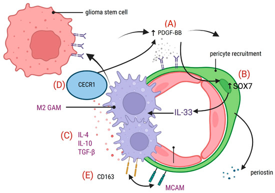 Reciprocal interactions between TAMs and pericytes promote glioblastoma progression. (A) Pro-tumoral macrophages (M2 TAMs) induce upregulation of PDGFR-β in glioma cells, generating a PDGF-BB signaling loop that enhances pericyte recruitment. (B) Activation of the PDGF-BB/SOX7 axis in pericytes stimulates the release of IL-33. IL-33 induces polarization of TAMs to an immunosuppressive M2 phenotype and supports tumor angiogenesis. (C) Pericytes secrete other anti-inflammatory cytokines, such as IL-10 and TGF-β, that reinforce immune evasion. (D) CECR1 secreted by macrophages supports M2 TAM polarization and enhances PDGF-BB/PDGFR-β signaling. (E) The MCAM/CD163 axis mediates interactions between pericytes and TAMs, promoting macrophage reprograming toward a pro-tumoral phenotype. These reciprocal interactions foster immune suppression, angiogenesis, and glioblastoma progression. Abbreviations: TAMs, tumor-associated macrophages; GB, glioblastoma.