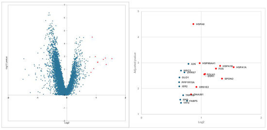 From differential gene expression results, we focused on overexpressed genes in the extraprostatic groups. Using differential gene expression on PanCK+ cells enrichment analyses, we identified 11 genes that were the most dysregulated on the Volcano-plot. These genes belong to the heat shock protein (HSP) family (DNAJB1, HSPA8, HSP90AA1, HSPA1B, and HSPA1A) and are genes involved in metastatic spread (EGR1, OR51E2, SPON2), the prostate specific membrane antigen (PSMA) gene FOLH1, and two proto-oncogenes FOS and JUN (Figure 1 and Figure S1).