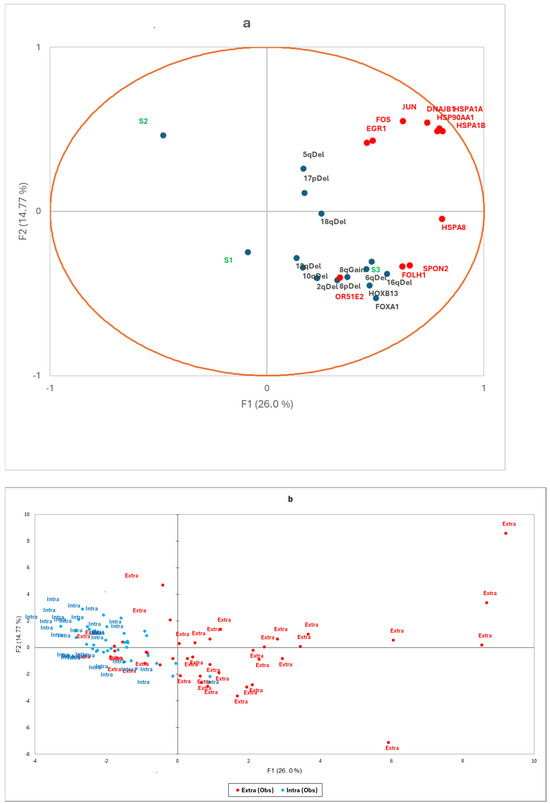 (a) Factorial analysis of mixed data and (b) factorial map of observations. The factorial analysis chart (a) illustrates correlations between the expression levels of the 11 candidate genes (DNAJB1, HSPA8, HSP90AA1, HSPA1B, HSPA1A, EGR1, OR51E2, SPON2, FOLH1, JUN, FOS) and transcriptomic signatures, including androgen receptor enhancers (HOXB13, FOXA1), ERG-dependent aggressiveness (S1, S2, S3), and eQTLs associated with copy number changes (2q, 5q, 6q, 8p, 10q, 13q, 16q, 17p, 18q deletions, and 8q Gain). The factorial map (b) shows the principal coordinates, highlighting extraprostatic tumours (in red) and intraprostatic tumours (in blue).