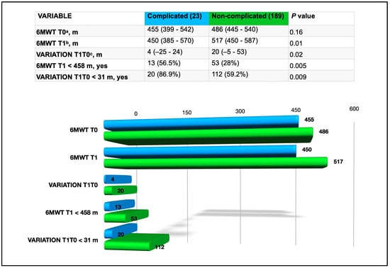 On the other hand, considering the results of the 6MWT (Figure 2), the meters walked during the 6MWT-T1 and the T1-T0 variation were significantly correlated to the cardiopulmonary complications at the univariate analysis.